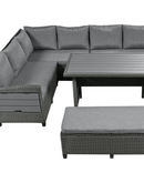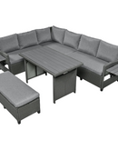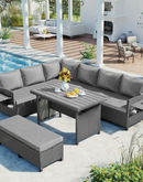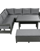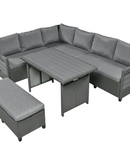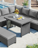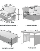 - 5-Piece Sectional Sofa Set: With 2 loveseats with side tables, 1 corner sofa, 1 long bench, and 1 dining table, this set can comfortably seat 7 people. The spacious dining table is perfect for placing food and drinks, allowing you to enjoy your outdoor space to the fullest.