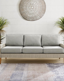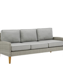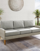 The Capella Outdoor Wicker Sofa Gray/Acorn brings coastal swagger to your outdoor space. With its cool neutral tones and natural finishes, this outdoor sofa creates a relaxing atmosphere for lounging solo or shooting the breeze with friends. Crafted with all-weather resin wicker and quick-drying olefin fabric cushion covers, it combines durability and style to become a unique outdoor essential. The sofa features hand-painted steel tapered legs that offer a natural wood look with better durability than traditional wood furniture. The moisture-resistant high-grade cushion cores provide maximum comfort, while the removable cushion covers are machine washable for easy maintenance. Whether used as balcony furniture or porch furniture, this modern coastal patio sofa is designed to withstand the elements and keep your outdoor space looking good. Get the Capella Outdoor Wicker Sofa Gray/Acorn and elevate your outdoor living experience!