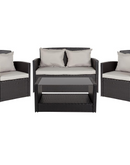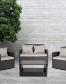 This cozy light gray seating group is essential to any outdoor space. It is an invitation to relax and unwind in comfort on navy weather resistant cushions crafted for durability. This ensemble features a loveseat, two arm chairs and a black tempered glass topped coffee table with a lower shelf for storage, making it an entertainment retreat. This set is constructed of tightly woven all weather rattan and has removable cushion covers. The striking details of curved and straight lines makes this suite even more inviting. If you are looking for an outdoor chic look that is welcoming all season long, this is for you!