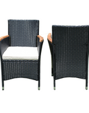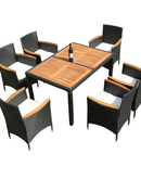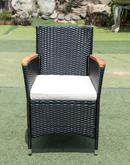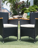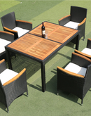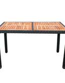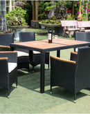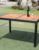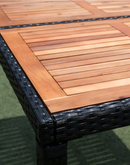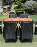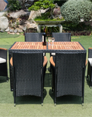 This modern and stylish dining set is constructed with all-weather reinforced hand-woven rattan and features a durable rustproof powder-coated metal frame. The acacia wood table top adds a touch of elegance to your outdoor space.