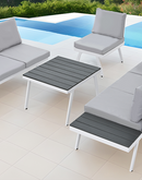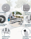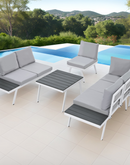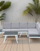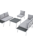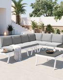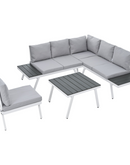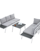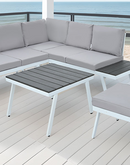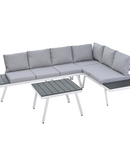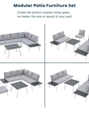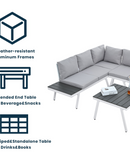 Elevate your backyard with this industrial-style 5-piece aluminum outdoor patio furniture set. With a modern garden sectional sofa set, end tables, coffee table, and furniture clips, this complete patio set is tailor-made for luxurious outdoor relaxation.
