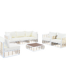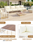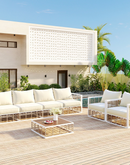 | Summary | Dive into the world of comfort with our 7-piece Outdoor Sofa Set, where metal frames meet the charm of rattan weaving, all styled in modern silhouettes with solid lines. This set includes 6 separate sofas and 1 square coffee table, all designed to elevate your outdoor lounging experience. The adjustable feet ensure stability on any terrain, while the plump 4.7" thick cushions and 8 pillows offer unmatched comfort and durability against all weather conditions.Whether you're hosting a sunny brunch or a starlit gathering, this sectional sofa set's free combination design adapts to your space and event. |