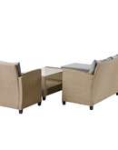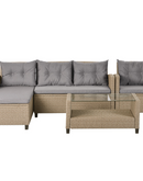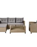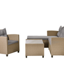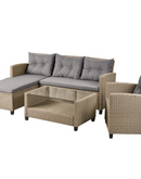 Upgrade your patio with this stunning 4 piece conversation set. Designed with both elegance and durability in mind, this set is perfect for enjoying your outdoor space with family and friends. The set includes a 2 seater sofa, lounge sofa, coffee table, and sofa chair, offering plenty of room for relaxation.