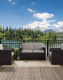 - Moisture-Resistant Cushions: The loveseat and chairs come with moisture-resistant high-grade cushion cores. The included gray outdoor cushion covers with white piping are made from high-performance solution-dyed polyester, which resists mildew, sun fade, and abrasion. They are also machine washable for easy maintenance.