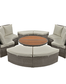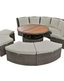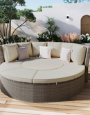 | Summary | Experience the ultimate in outdoor relaxation with our 5-piece all-weather PE rattan sofa set. Featuring a sturdy metal frame and four cozy loveseats, this set is perfect for any outdoor space. The centerpiece is a unique, round, liftable table with a stylish wood tabletop, offering multifunctional use and flexibility. Enjoy the ease of free combination to suit your space and style. The set includes 9 cushions with fixable buttons for added comfort and 6 pillows. All of them are with washable covers for your convenience. Adjustable feet ensure stability on any surface. Available in 2 colors to match your outdoor decor. |