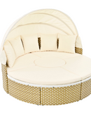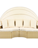 Our round sectional sofa seamlessly transforms into an organized daybed, offering unparalleled versatility and comfort. The retractable canopy, easily fastened by straps, allows you to enjoy the sun or relax in the shade on your terms. This feature, coupled with the daybed's curved design, invites you to lounge in secluded luxury or engage with guests in a unique outdoor setting.
