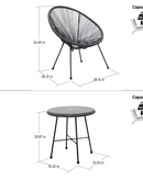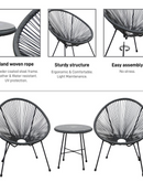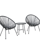 Introducing the Sassio 3 Piece Conversation Patio Set in Grey. This modern and elegant patio furniture set includes two hand-woven rope chairs and one coffee table with a 5mm tempered glass tabletop. It's the perfect addition to any outdoor lounging space, offering a minimalistic touch and superior comfort.