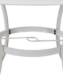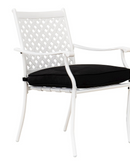 - Four powder-coated white steel chairs with removable weather-resistant beige fabric seat cushions