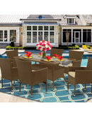 Furnish your patio dining area with this elegant Wicker Patio Set Brown, OSBK7-02A. This 7-piece outdoor-furniture set includes an acacia wood top table and 6 single armchairs, providing you with a comfortable and stylish seating solution for your outdoor space. Whether you're hosting an intimate gathering or enjoying a family dinner, this contemporary dining set will elevate your outdoor dining experience.