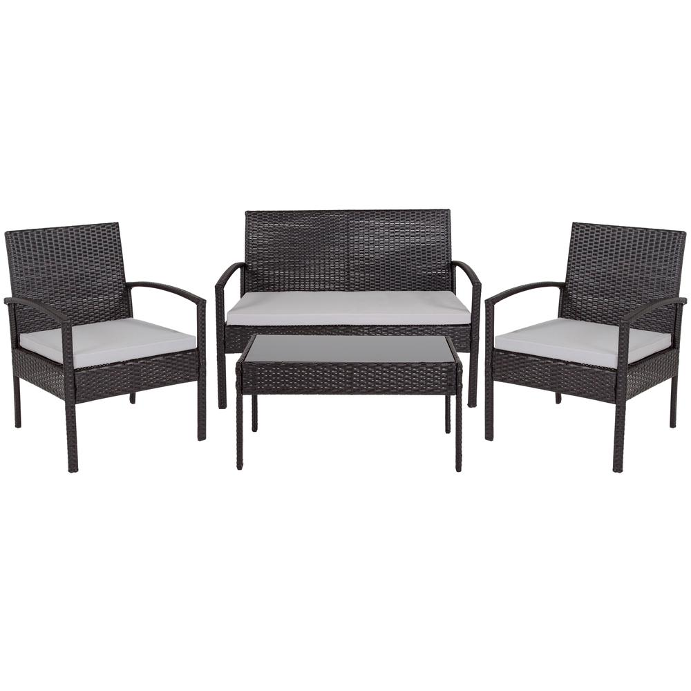 This stylish gray four piece grouping with its navy all-weather cushions includes a loveseat, two armchairs and matching coffee table. Each piece has a durable metal frame and an interlocking woven rattan design. The loveseat a...